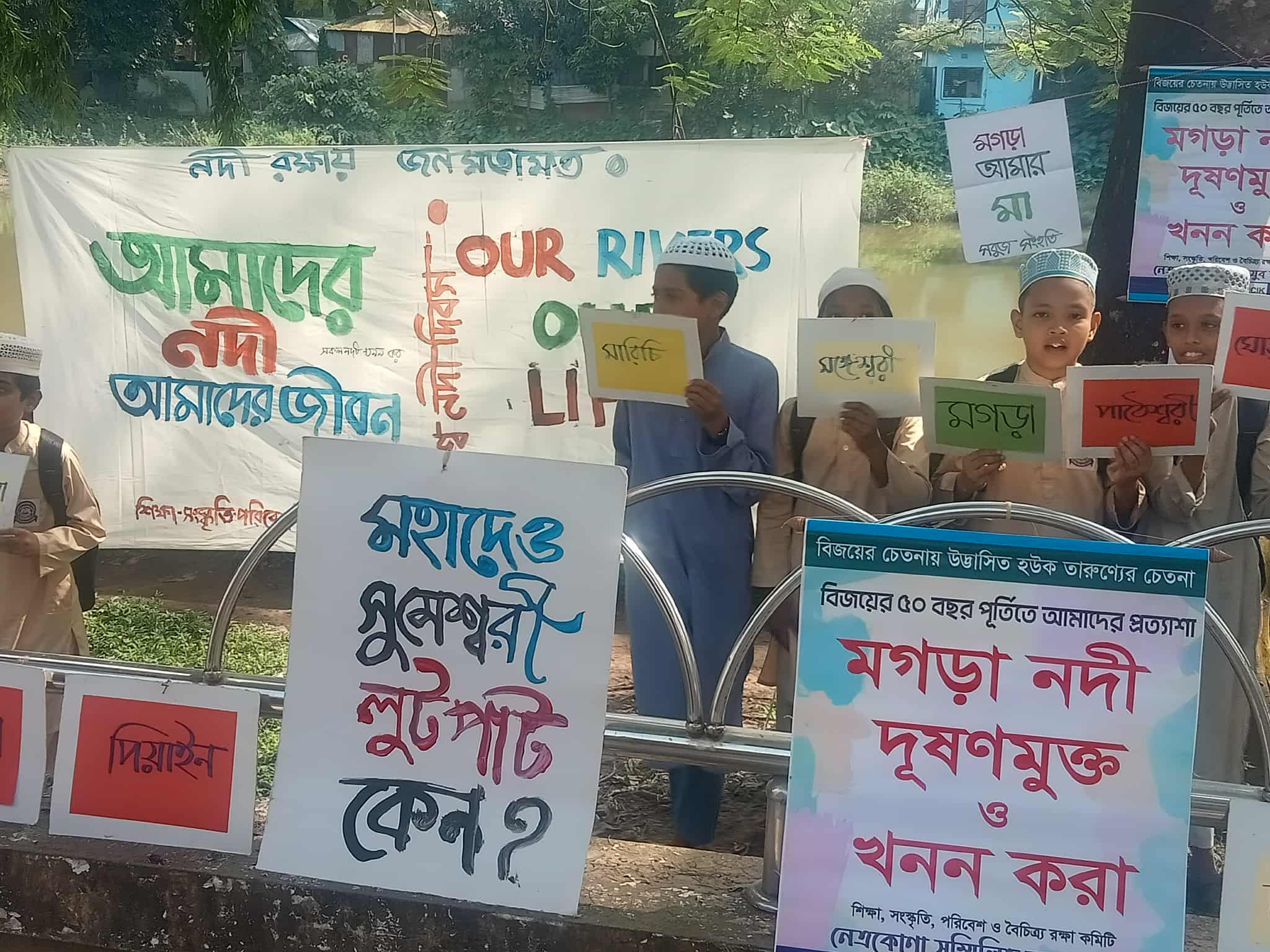 Holding hand-written signs, the participants, including madrasa, school, and college students, demanded that all rivers in the Netrokona district be freed from encroachment, protected from pollution, and dredged.