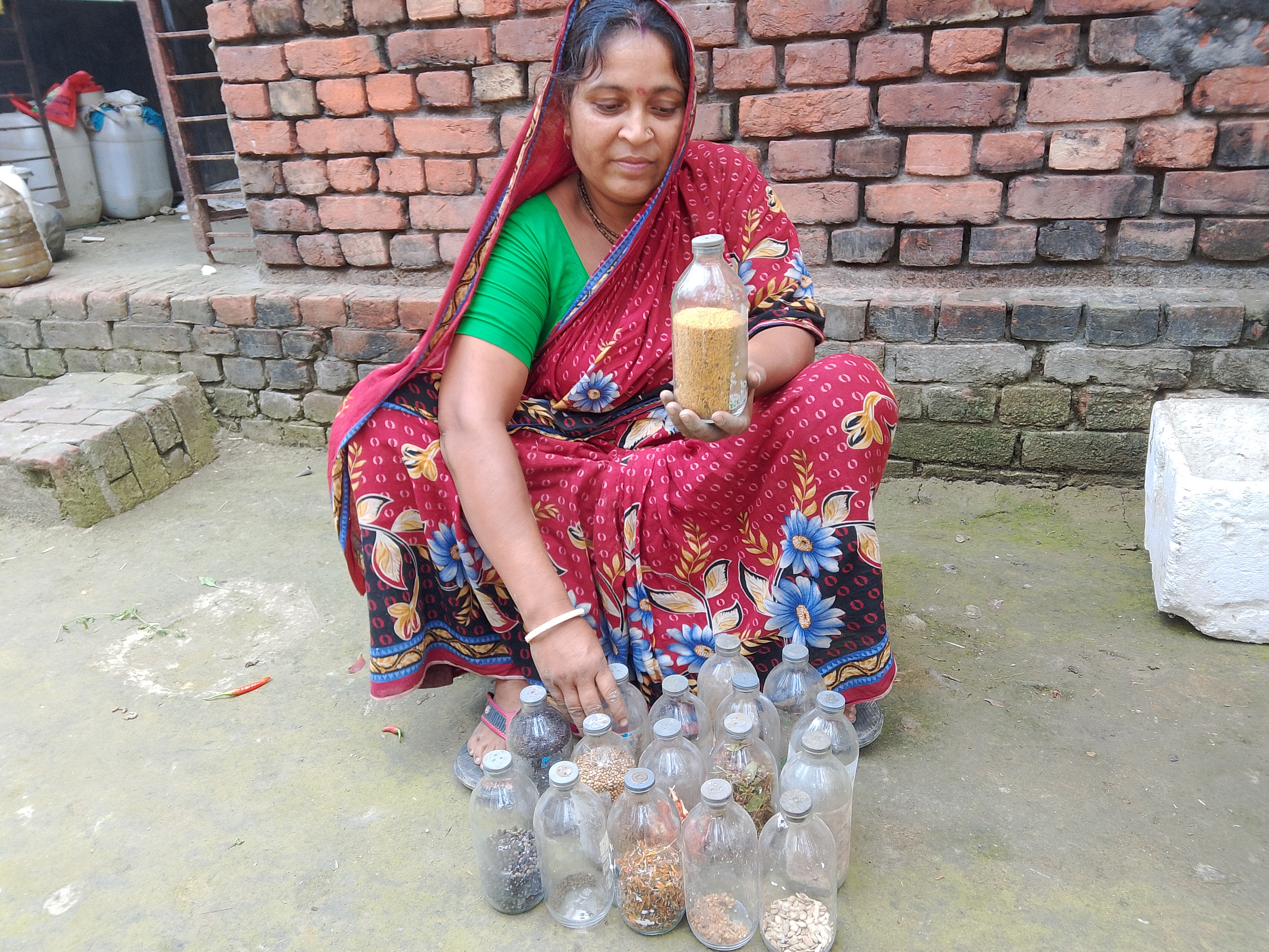 Since joining BARCIK’s activities in 2024, Nilima has diversified her homestead farming with her husband’s support. She cultivates a wide range of seasonal vegetables including potatoes, tomatoes, eggplants, pumpkins, beans, spinach, cauliflower, cabbage, radish, gourds, cucumbers, chili, onions, garlic, turmeric, and paddy in the aman season. This diversity meets her family’s nutrition needs and reduces market dependency. She has even set up a small seed bank at home to conserve native varieties of seeds.